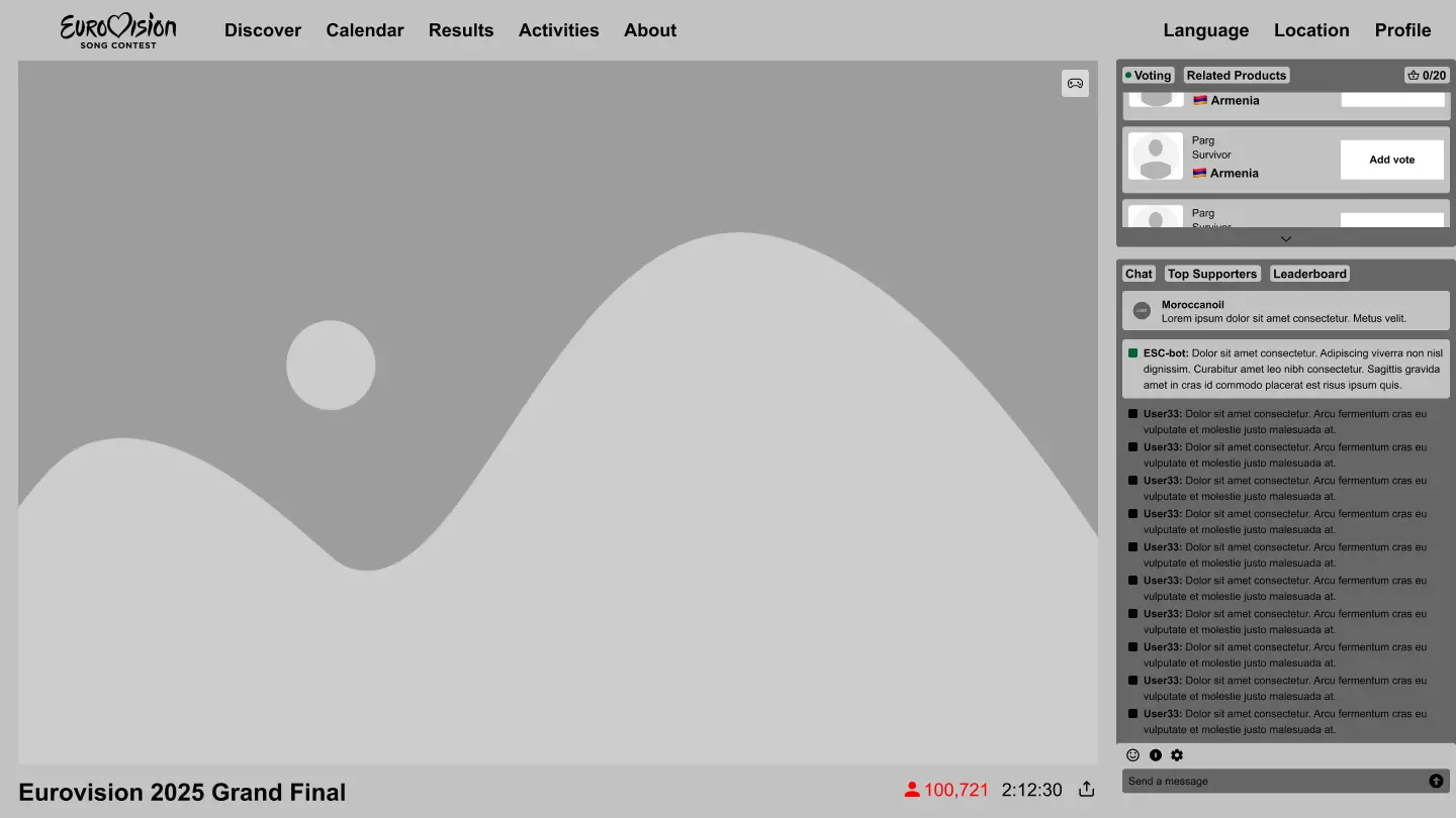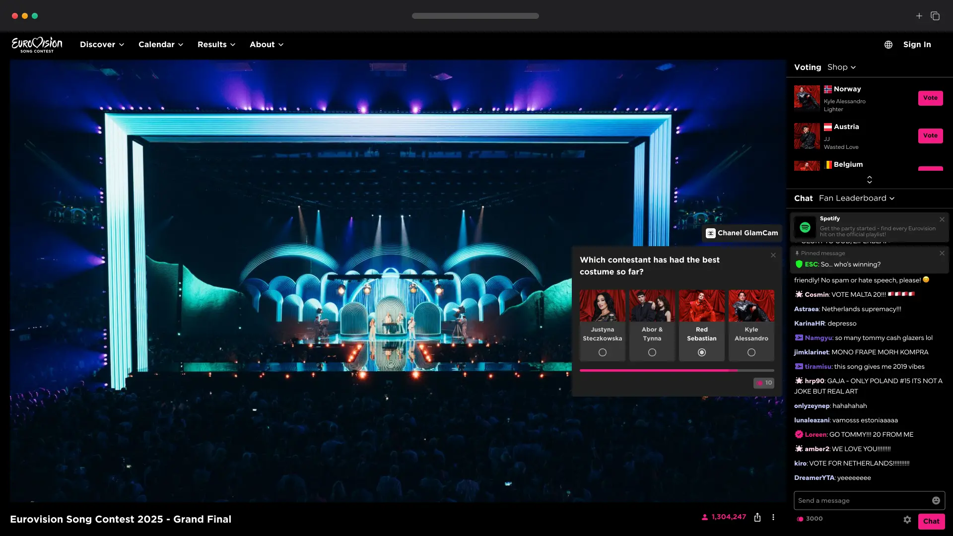 Chat should remain prominent to maintain event energy. Social context is core to the Eurovision experience and hiding the chat would undermine this.